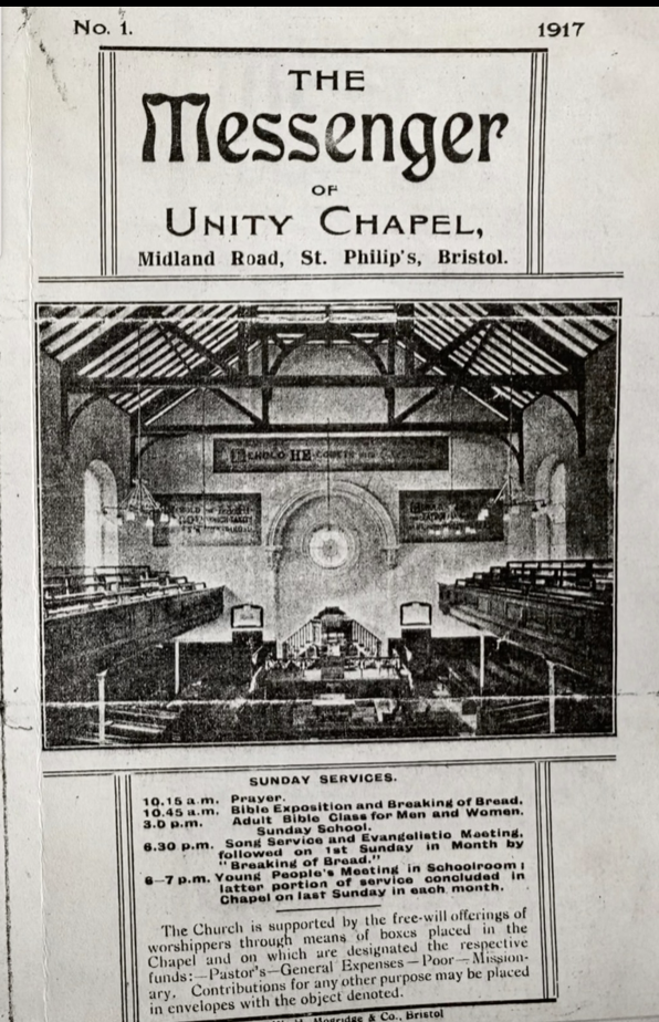Back in St.Phillips, the growing congregation had outgrown the small house in Goat Alley and in 1855 a small chapel seating 200 was erected in nearby Unity Street. In 1862 a much larger building, seating 800 was opened on Midland Road and this became the permanent centre for the work. After further building efforts the building could comfortably seat 1,200 worshippers.